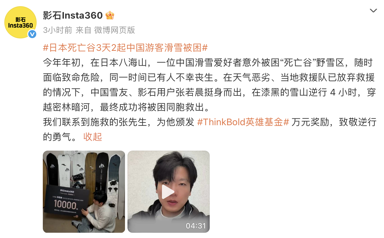 3月30日,影石Insta360通过「ThinkBold英雄基金」为张若晨颁发万元奖励。作为一名滑雪发烧友,张若晨长期使用影石全景相机拍摄滑雪视频并分享在社交平台,从记录日常到获得基金关注,这份特殊的联结让这场救援多了一层温暖的回响。