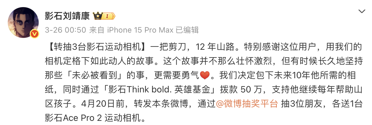 3月26日,智能影像企业影石Insta360通过「ThinkBold英雄基金」向刘佳资助50万元,并承担其未来10年拍摄所需的相纸。作为一名骑行爱好者,刘佳曾使用影石全景相机记录自己骑着28大杠穿行乡野的画面,并将这些影像发布在社交平台上。从记录个人生活,到记录乡村孩子们的纯真瞬间,影石的镜头见证了他这份坚持的延续与温度。
